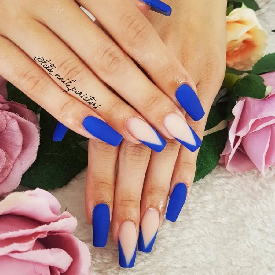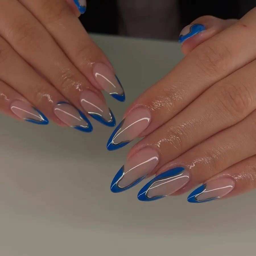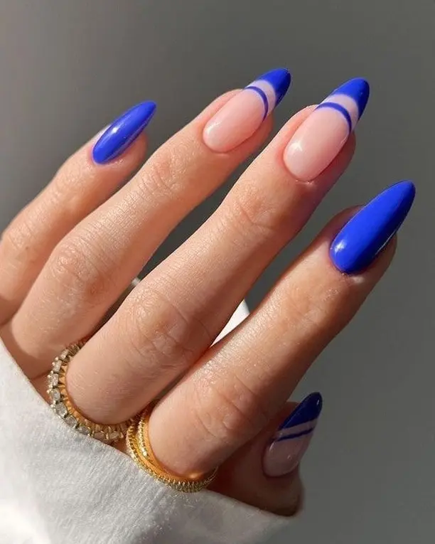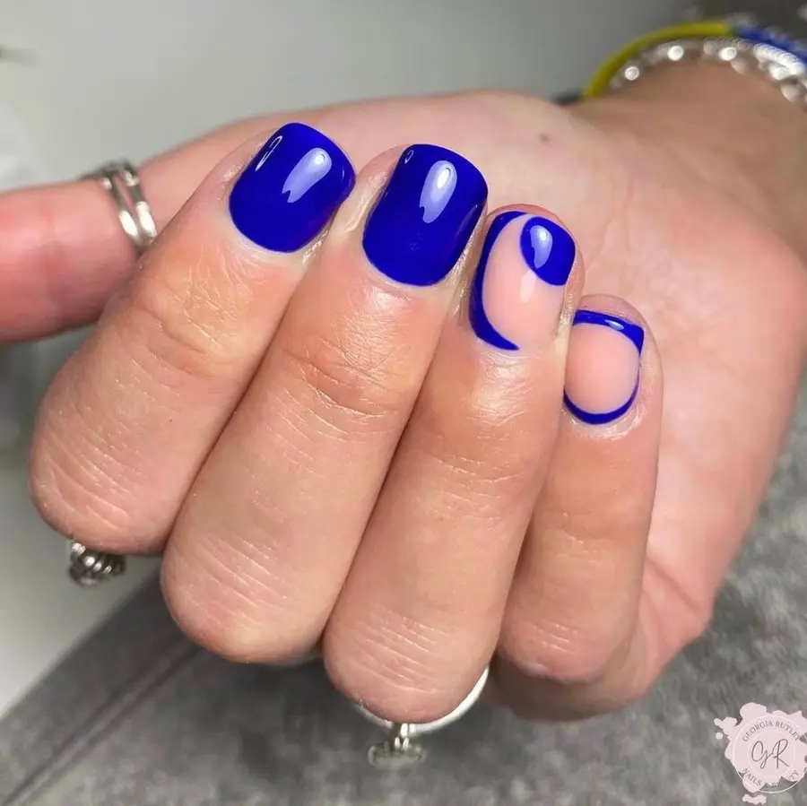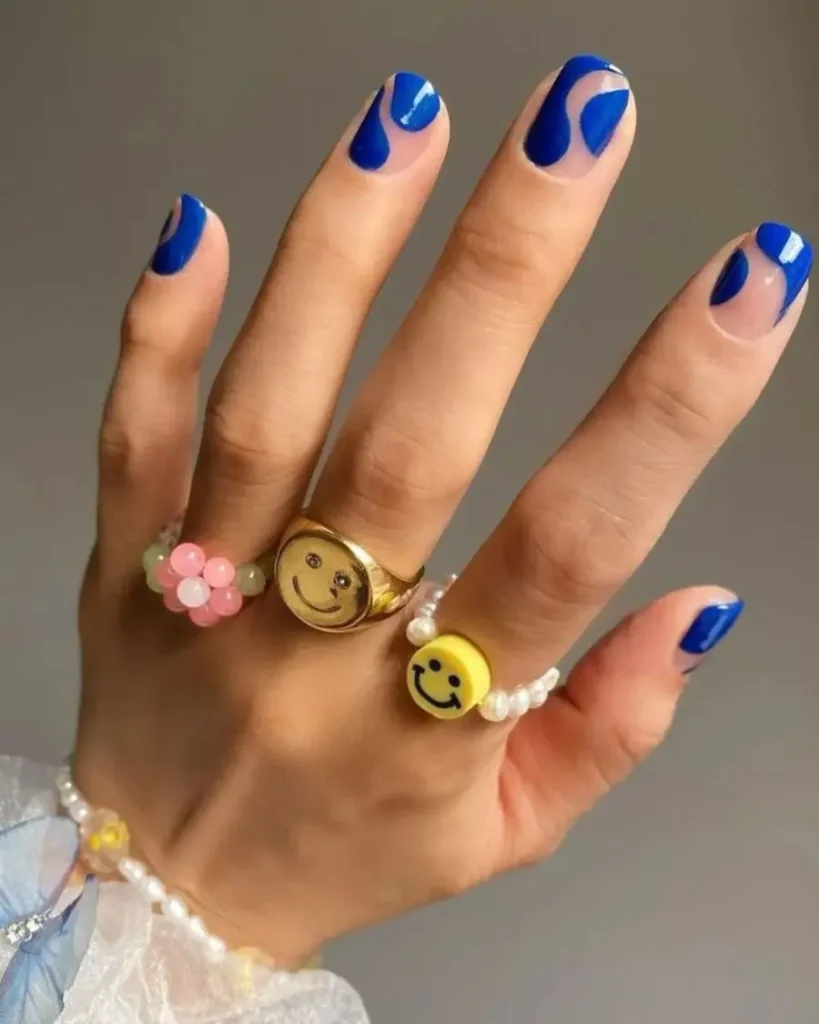 A fresh take on French tips, these royal blue nails designs combine nude bases with abstract blue curves. The balance of negative space and color keeps the look clean, modern, and effortlessly cute.