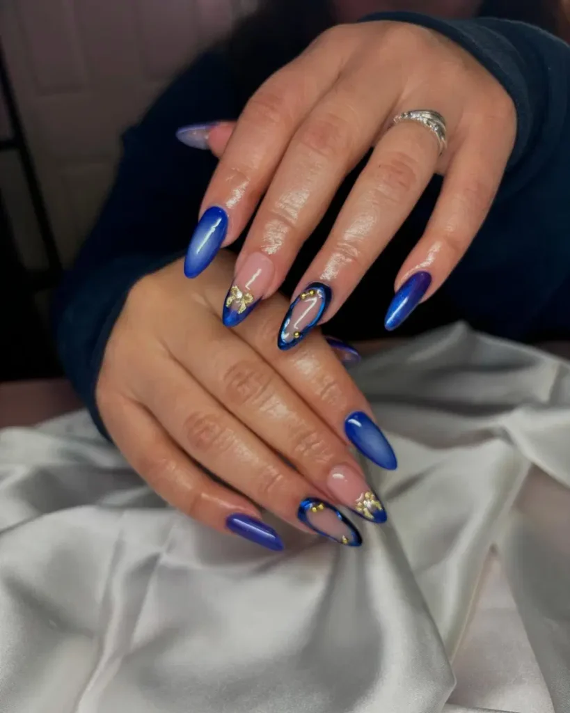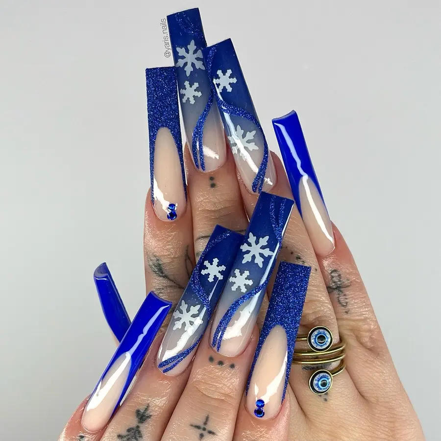 This look leans into statement-making royal blue nails designs with long coffin shapes and icy snowflake accents. The glittered blue edges add sparkle and drama, while the sheer base keeps the overall look wearable and chic. It’s bold, eye-catching, and perfect for standout moments.
