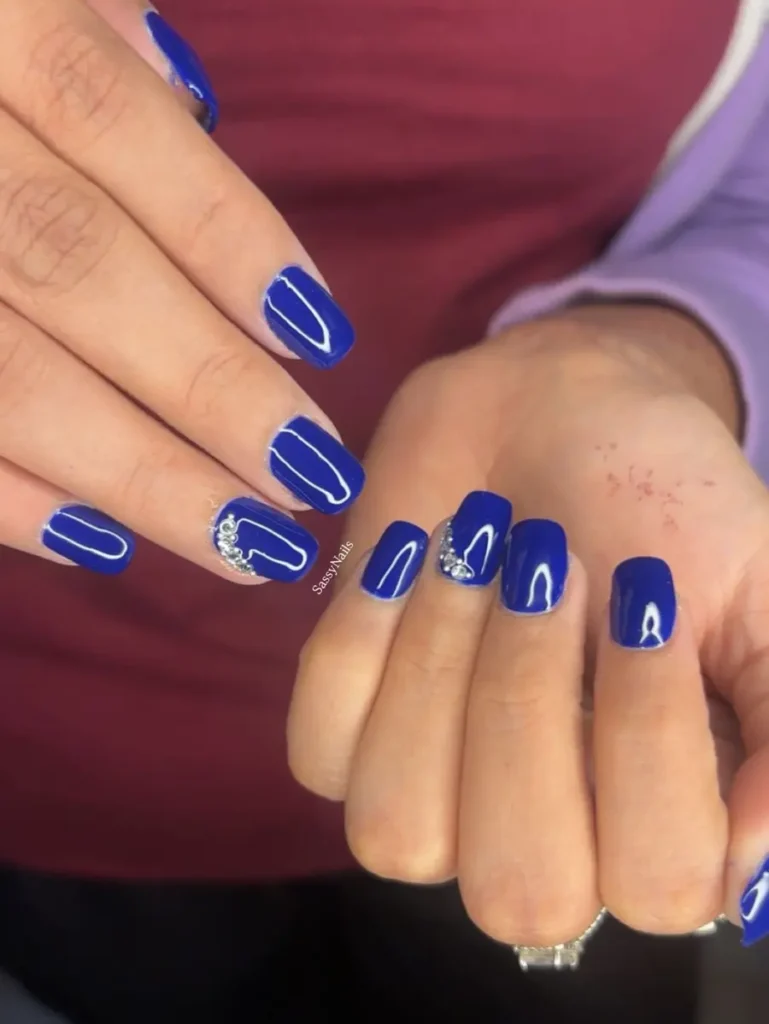 This soft shimmer look proves that shorter lengths can still feel bold and confident. The smooth finish catches the light beautifully, creating a chic, understated take on royal blue nails that feels perfect for everyday wear while still staying feminine and fun.