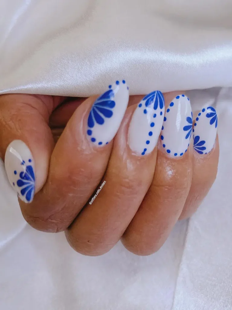 These royal blue nails combine crisp blue tips with delicate white floral details for a sweet, girly style. The soft nude base keeps the look airy and elegant, while the structured shape adds balance. It’s a beautiful blend of playful charm and everyday polish.