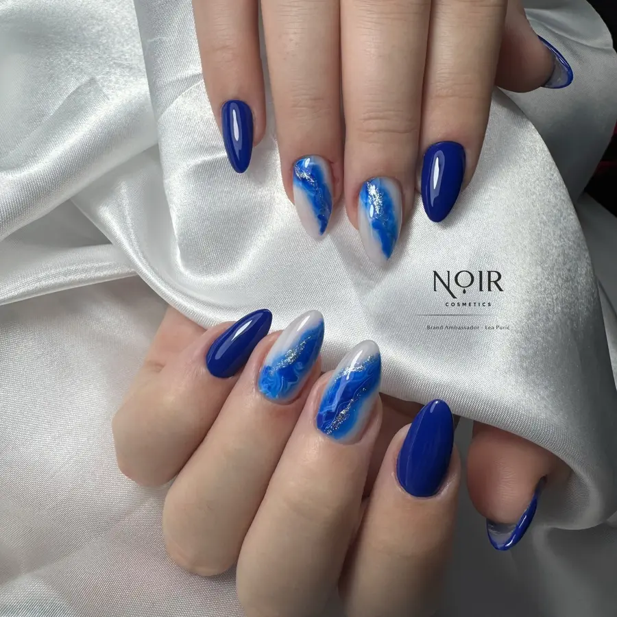 This design blends solid royal blue nails with marble-inspired accent nails for added depth and texture. The glossy finish and flowing patterns keep the look artistic while still fitting a feminine girly style.