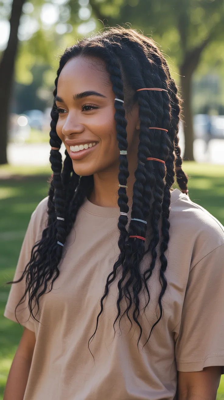 The image shows a beautiful example of this hairstyle, with defined twists and rubber bands adding a playful touch. The combination of the twists and the bands creates a unique look that stands out. This style is not only eye-catching but also helps to keep the hair protected and healthy.