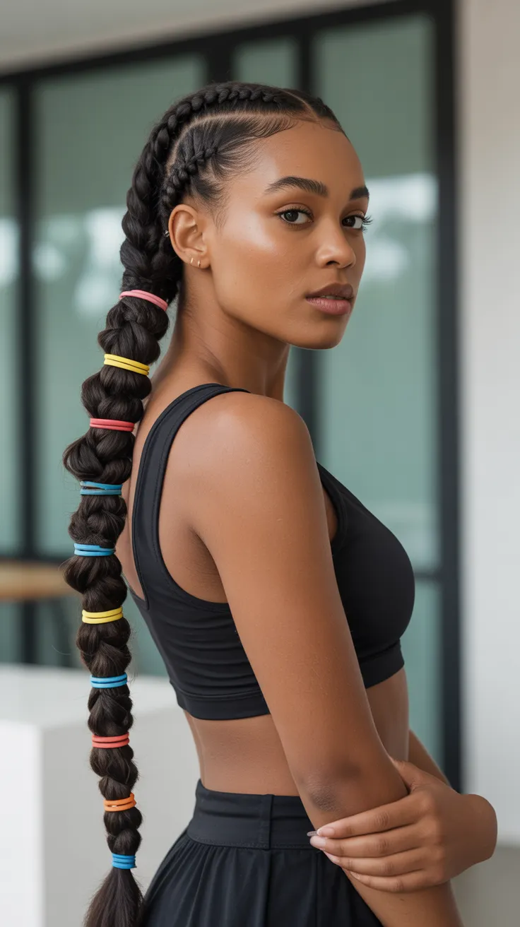 In the image, you can see a beautiful example of this hairstyle. The hair is neatly parted, and the braids are tightly woven, creating a polished look. The use of rubber bands at intervals adds a unique flair, making the hairstyle stand out.