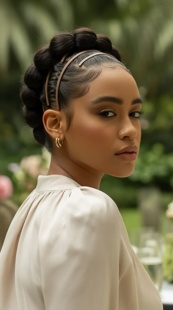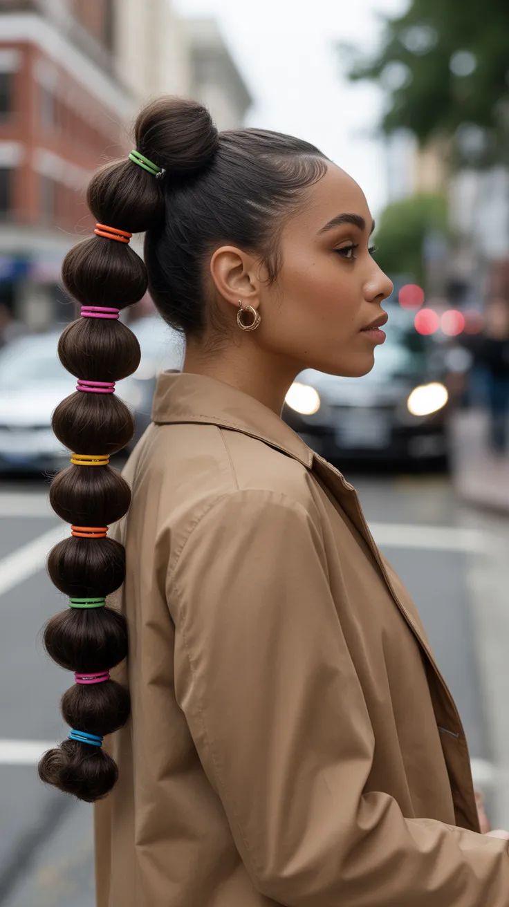 The image shows a young woman with her hair styled in bubble puffs, highlighting the versatility of this look. The puffs are neatly arranged and secured with bands, giving a polished yet playful vibe. This style is perfect for various occasions, whether casual outings or special events.