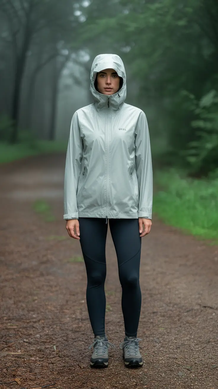 The bright yellow rain jacket adds a pop of color against the earthy tones of the forest. It’s not just about looks; this jacket keeps you dry and comfortable, making it ideal for unpredictable weather. Pairing it with sleek black leggings creates a streamlined look that’s both functional and chic.