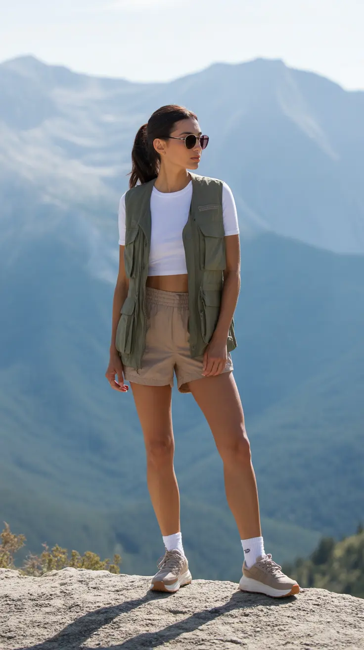 Trail shorts paired with a utility vest create a perfect blend of comfort and style for those who love the outdoors. This outfit is not just practical; it also reflects a laid-back, earthy style that resonates with nature lovers.