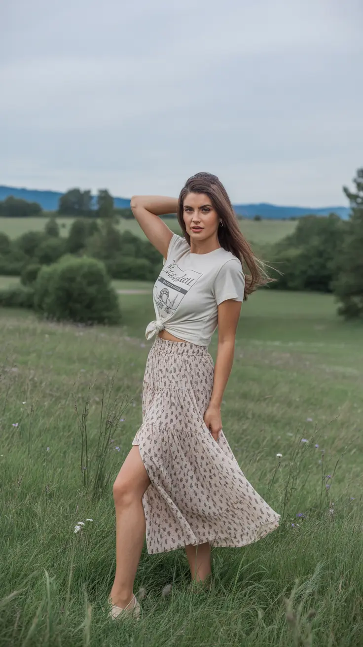 Earthy tones in the skirt complement the graphic tee, enhancing the nature-inspired fashion aesthetic. Whether you’re hiking, lounging by a campfire, or exploring a local park, this look provides the perfect outdoorsy outfit inspo. Pair it with sturdy boots, and you’re ready for anything!