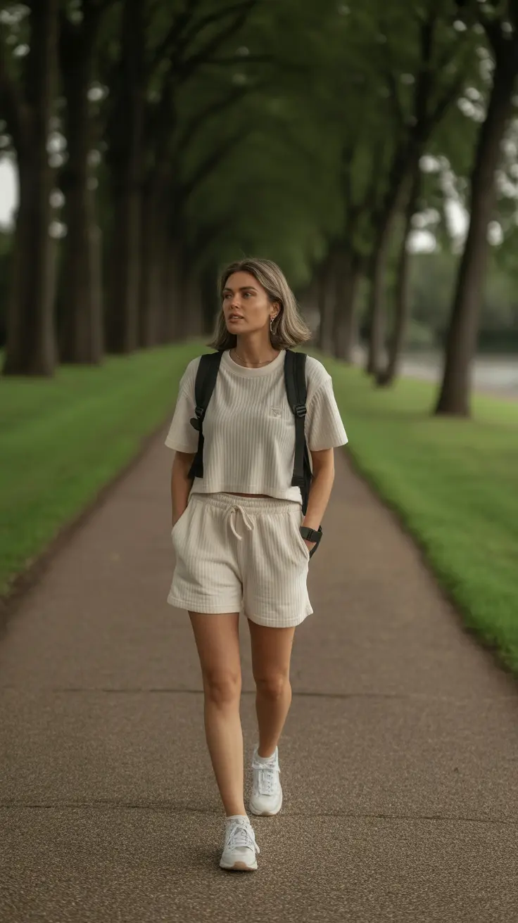 This outfit perfectly captures the essence of earthy style. A cropped tank top paired with paperbag shorts creates a relaxed yet chic look that’s ideal for warm days outdoors. The light blue tank adds a refreshing touch, while the neutral shorts keep things grounded.