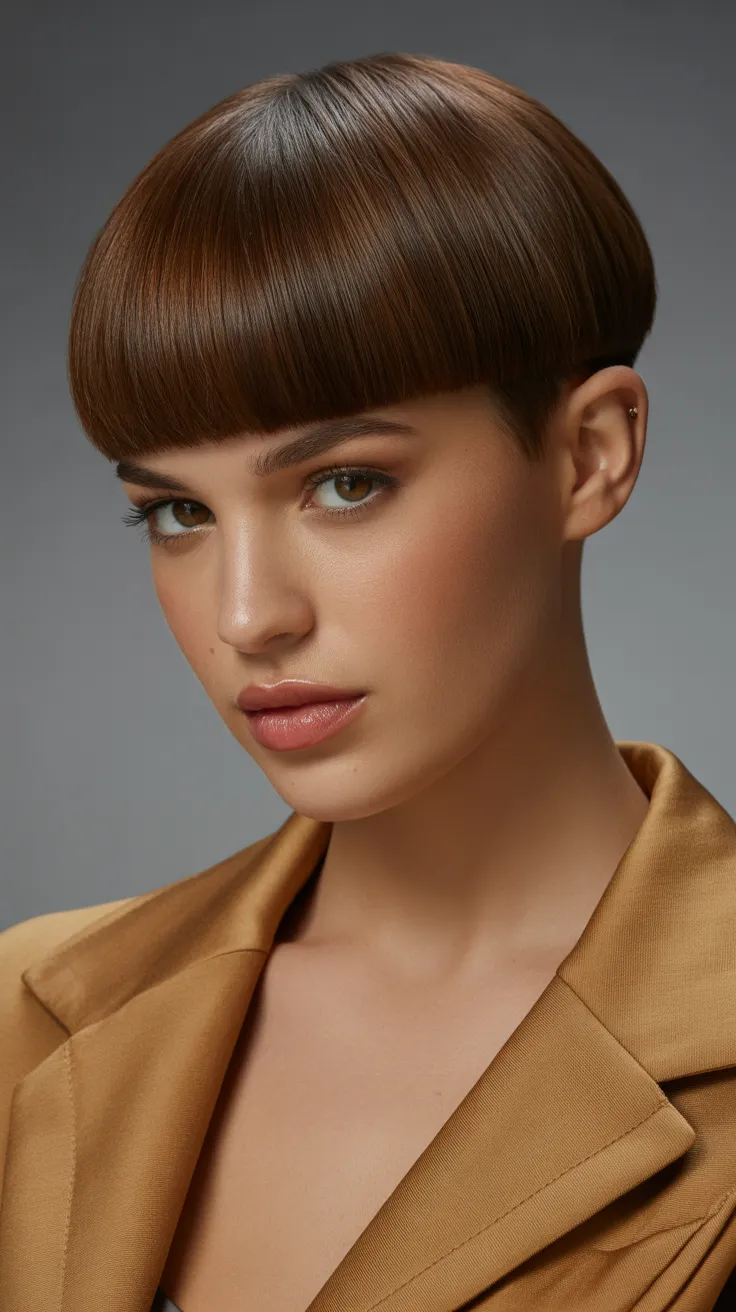 The glossy brunette bowl cut is a chic choice for anyone looking to rock short brown hair. This style is not only pretty but also practical for everyday wear. With its sleek finish, it can easily become your go-to look for any hair day.