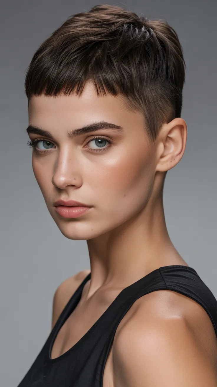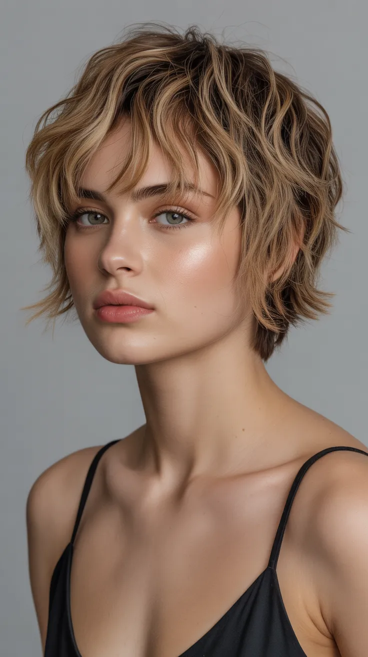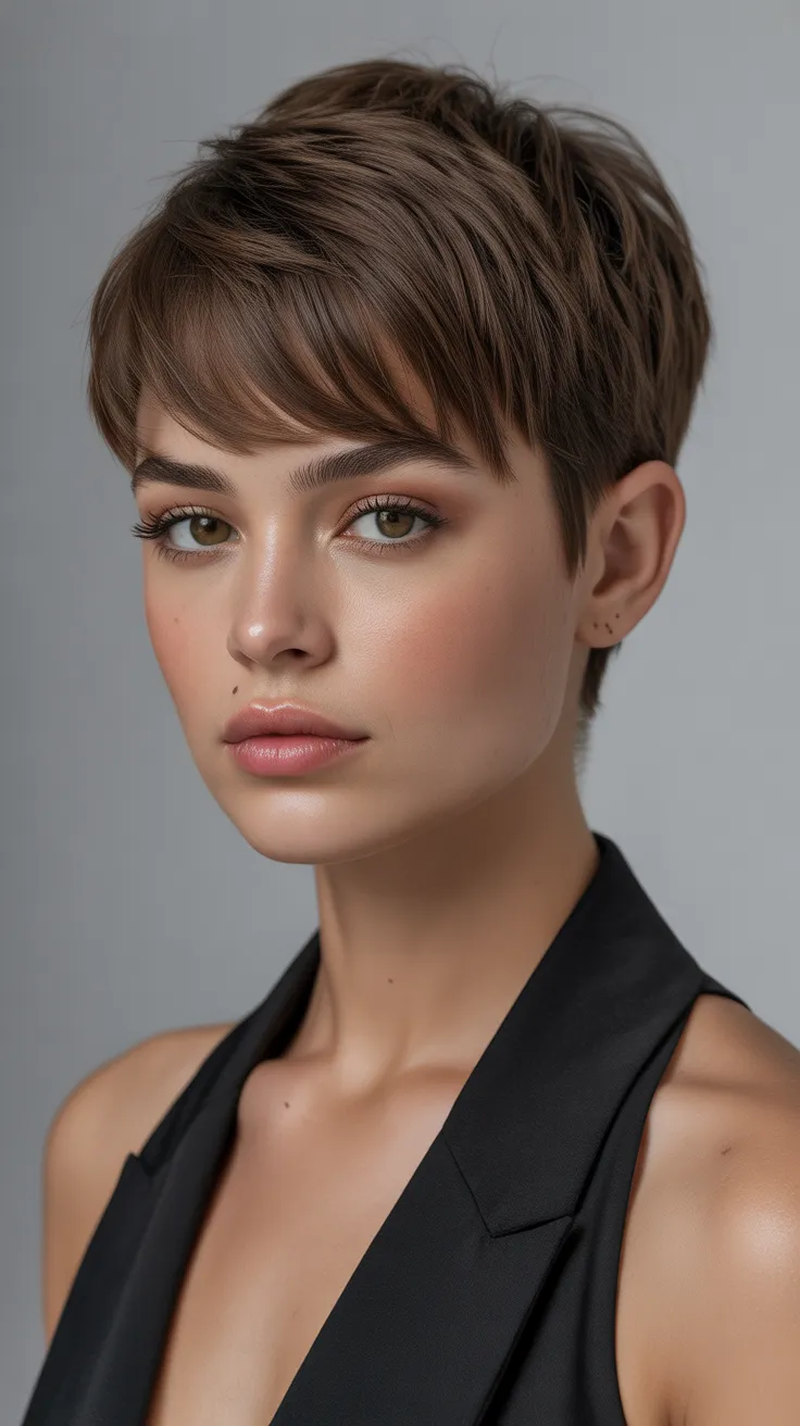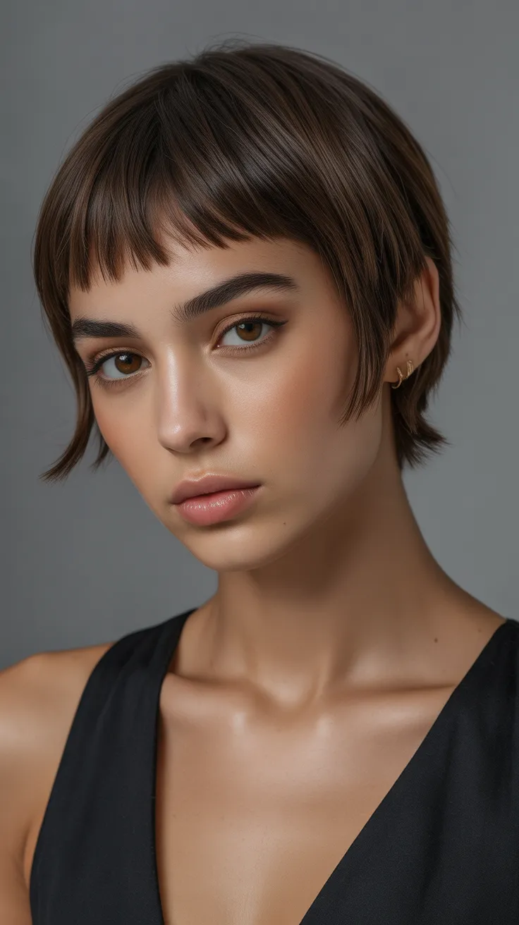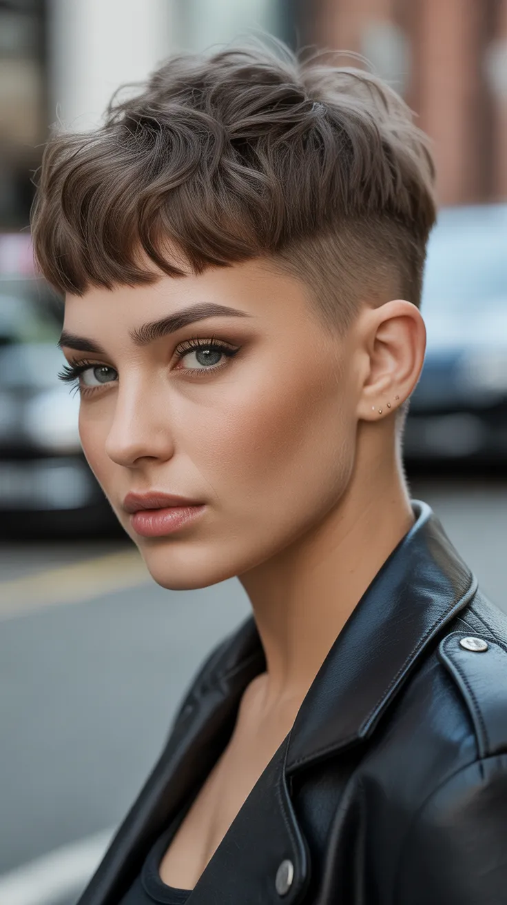 The short pixie mullet with a lifted crown is a fun choice for women with round faces. This style adds height and frames the face beautifully, making it a great option for those looking for short hair cute haircuts. Pair it with short bangs for an even more playful look!