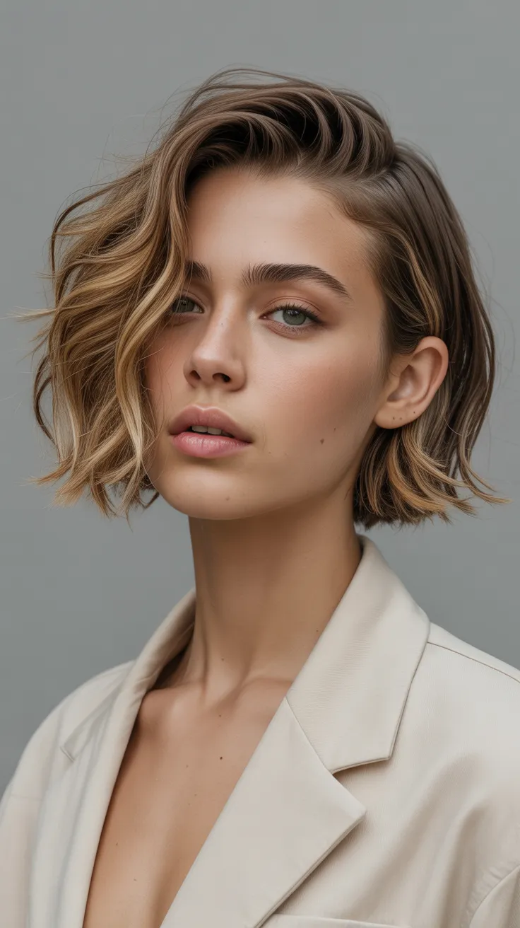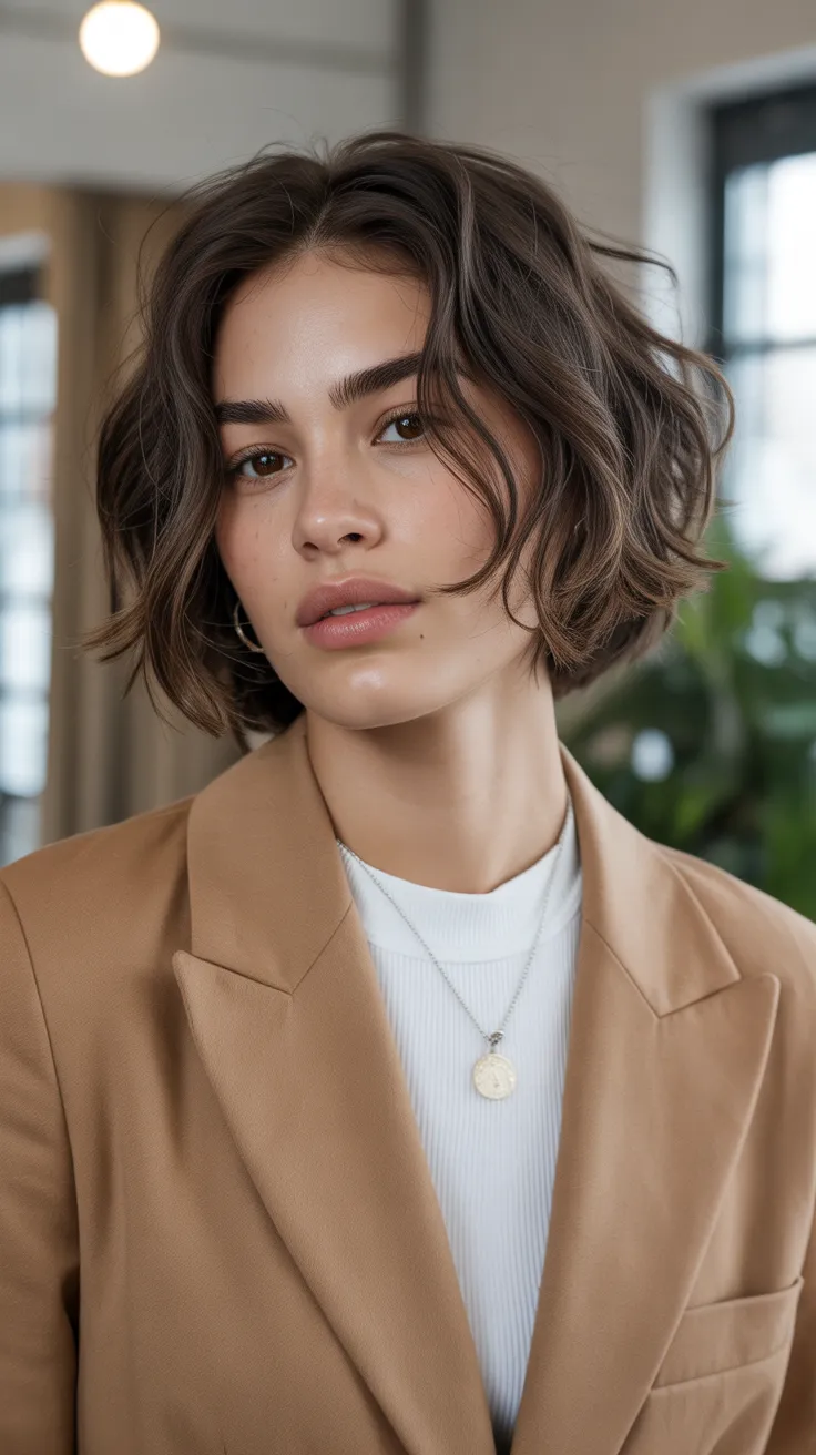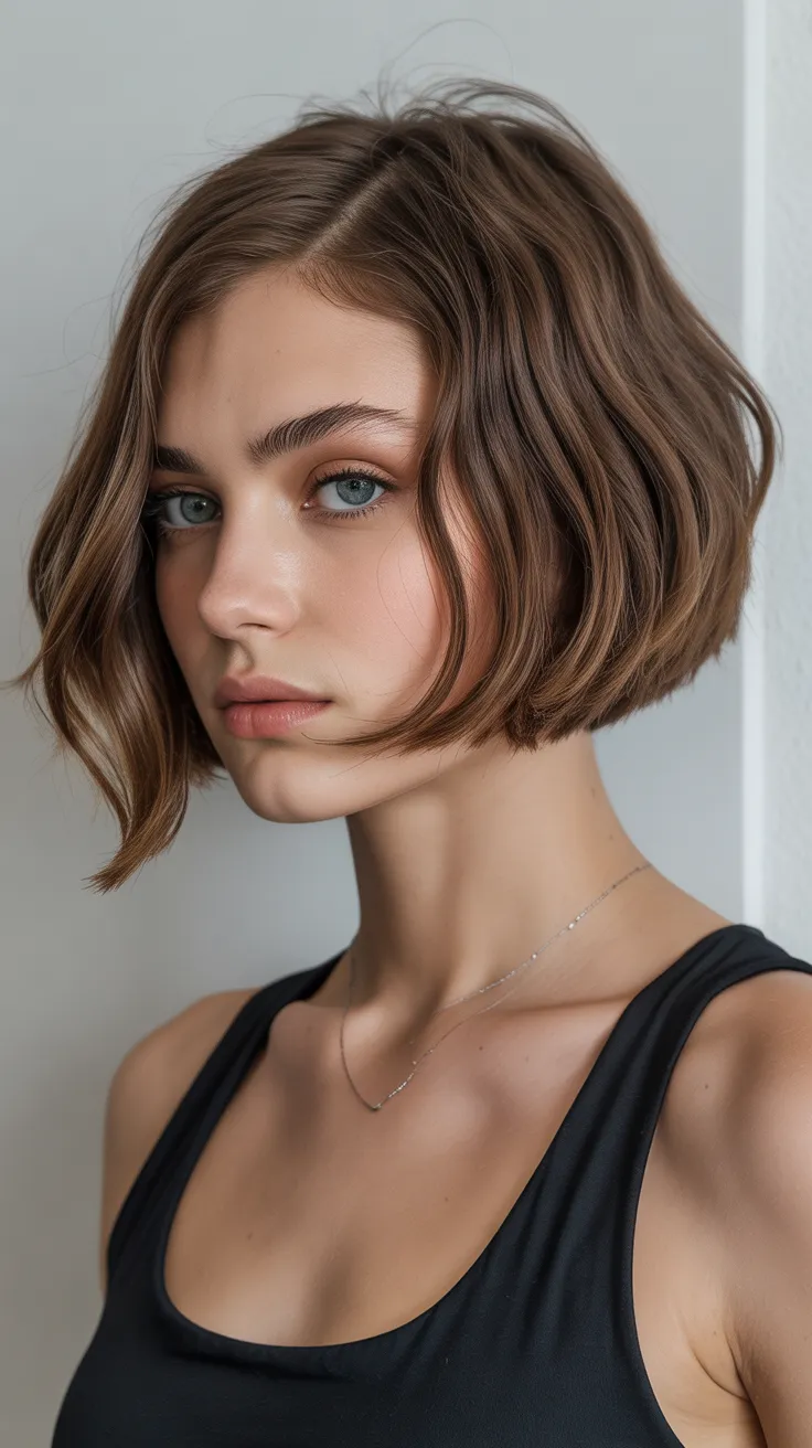 The bob cut with light waves and a middle part is a fantastic choice for women with round faces. This style adds texture and movement, making it playful and flattering. Plus, it works well with short bangs, creating a fresh look that enhances your features beautifully.