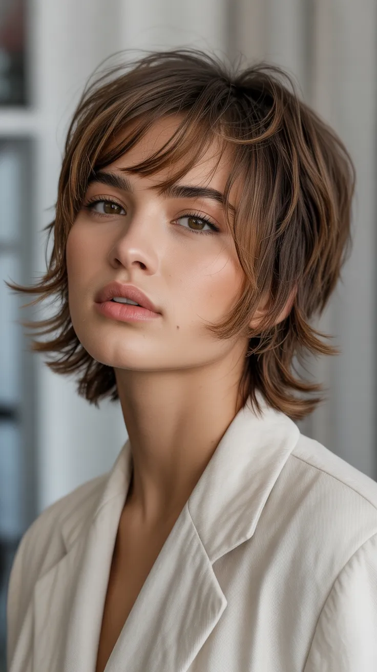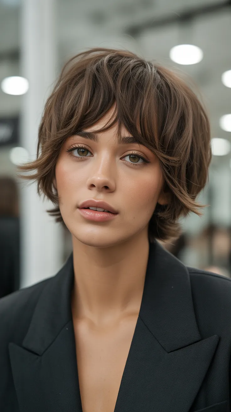 The soft shag cut with fringe layers is a fun choice for women with round faces. This style adds texture and movement, making it one of the cutest short hair cuts for women. Short bangs haircut can frame the face nicely, giving a playful vibe while keeping it stylish.