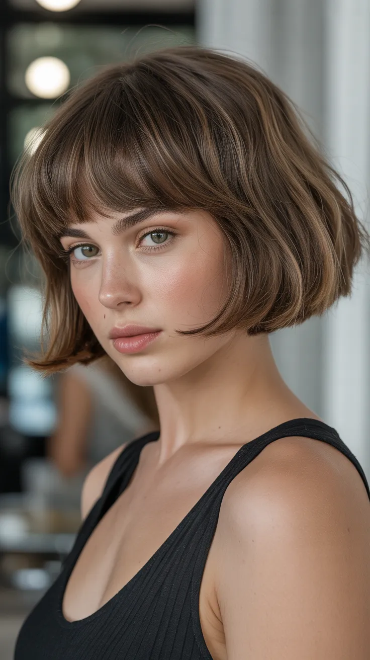 The classic French bob with curved bangs is a chic choice for women with round faces. This style features short hair that frames the face beautifully, making it a great option among short hair cuts for women. The soft bangs add a cute touch, enhancing your features while keeping things stylish.