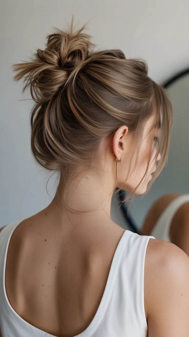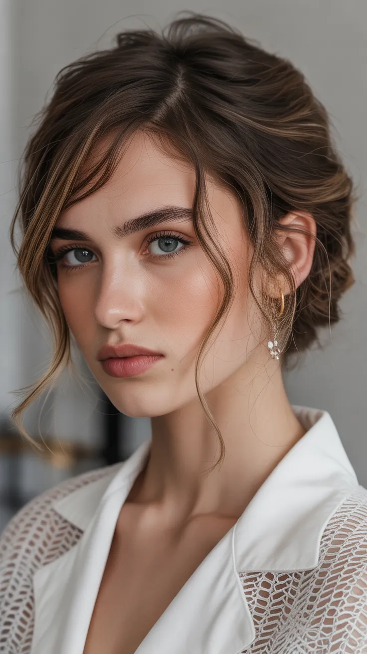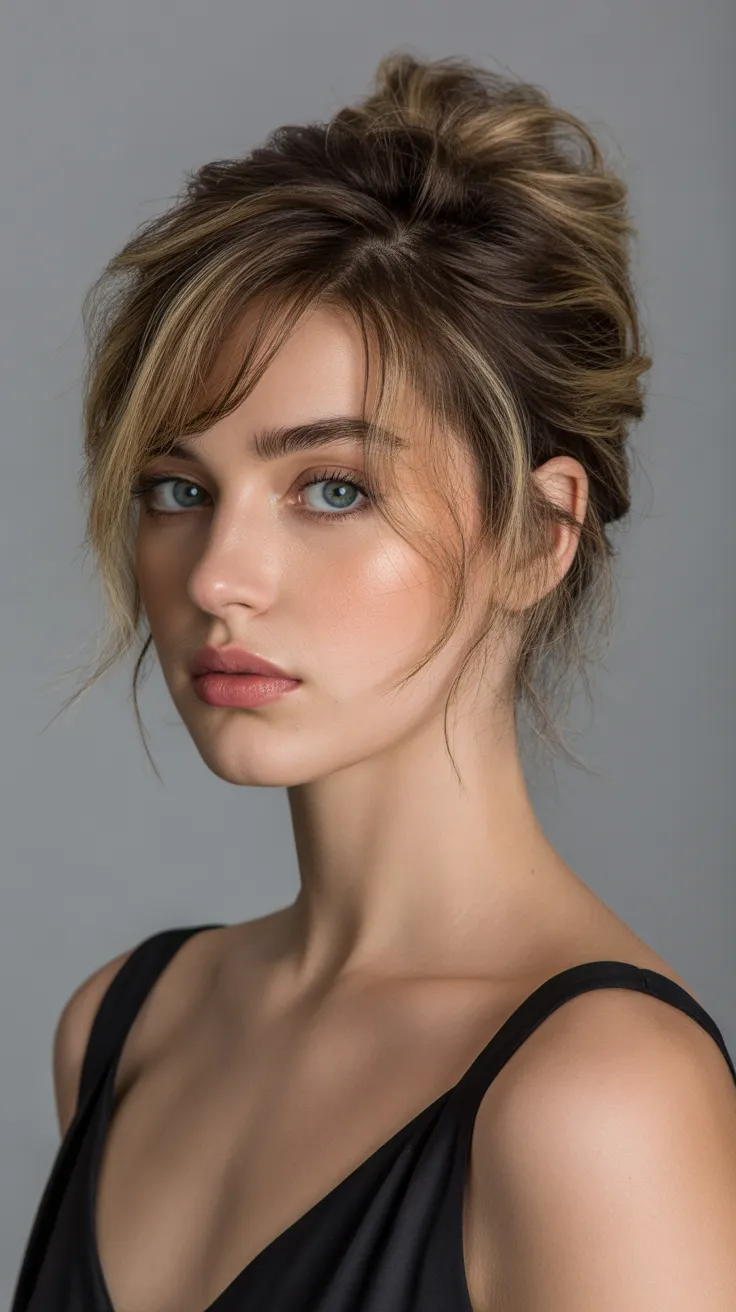 18. Short Hair Updo With Tousled Bun And Side Fringe