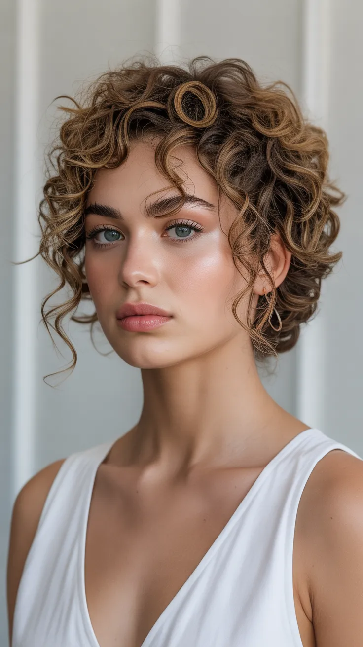 A short hair updo with a wet look texture is a stylish choice for any occasion. This easy hair updo gives off a chic vibe while keeping things simple. Perfect for weddings or casual outings, it’s a fun way to show off your short curly hair updo.