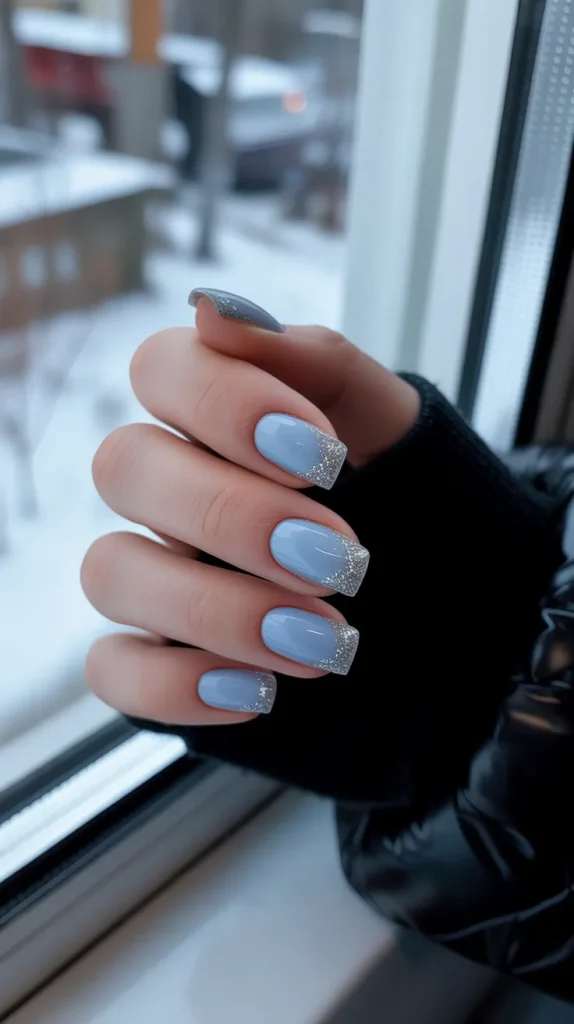Icy blue glitter fades give your short winter nails that βfrosted glassβ illusion. The gradient shimmer sparkles like morning frost delicate but captivating. Itβs one of those looks that feels magical without trying too hard. π