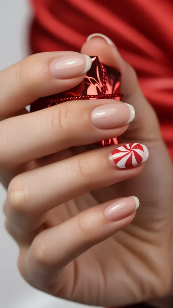 Candy cane accent nails bring playful holiday charm to your manicure. A single red-and-white stripe adds just enough festive flair without overdoing it. Perfect for low-maintenance xmas nails that still feel fun. π
