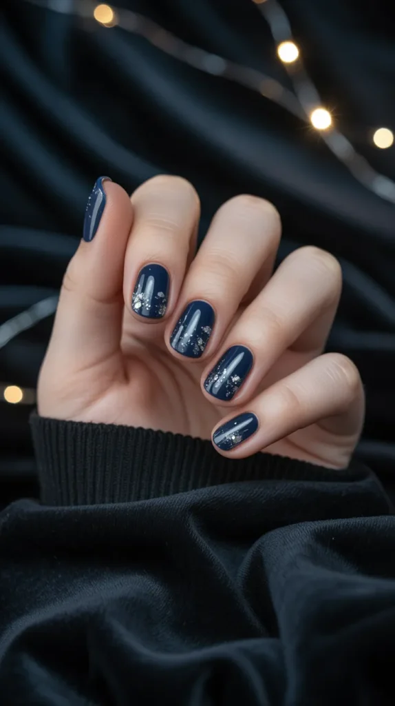 Navy sparkle nails shimmer like a midnight sky in December. The scattered silver glitter adds a subtle twinkle without overwhelming the color. Itβs a stunning, moody choice for xmas nails lovers who like a little mystery. π