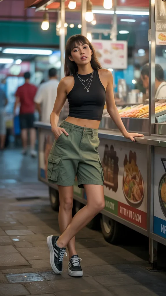 Olive cargo shorts styled with a fitted crop top create a sleek yet casual balance. The fitted top keeps it polished, while the cargo shorts bring in structure and detail. Imagine leaning against a food stall in a busy night market, neon lights glowing around you, your outfit giving off confident energy 🌮. Platform sneakers and layered necklaces complete the look with an urban touch. It’s playful, youthful, and trendy all at once. Women who want shorts outfits that are casual but still make a statement will love this option.