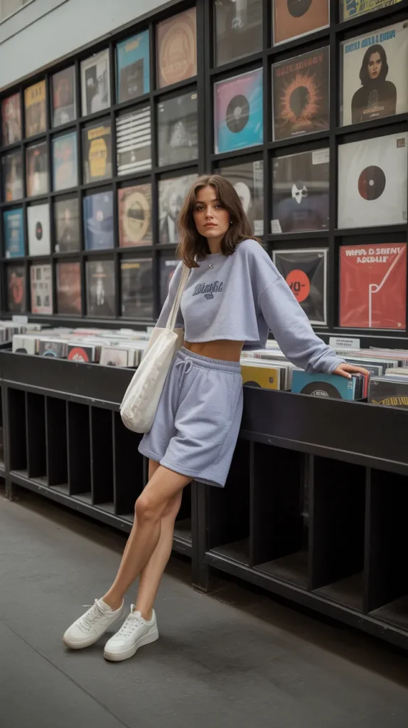 Baggy shorts paired with a cropped sweatshirt strike the perfect relaxed balance. The oversized feel of the shorts with a cropped top keeps the silhouette flattering. Picture leaning at a record shop counter, vinyl covers surrounding you, while your outfit gives off effortless, retro-cool vibes 🎶. Platform sneakers and a tote bag finish the look with a trendy touch. This is the type of shorts outfit women love for weekends, casual city strolls, or laid-back social hangouts.