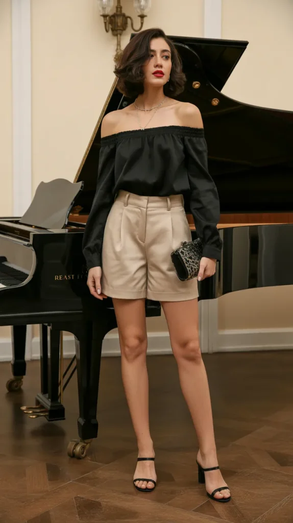 Tailored shorts with an off-shoulder blouse bring a refined yet relaxed energy to casual outfits. The black blouse paired with heeled sandals creates a chic, feminine balance. Imagine standing by a grand piano in a softly lit concert hall, the outfit blending elegance with ease 🎹. A clutch bag and minimal jewelry make it perfect for dinner dates or classy events. This style proves that shorts can be sophisticated while staying comfortable. Women who love timeless yet trendy looks will adore this pairing.