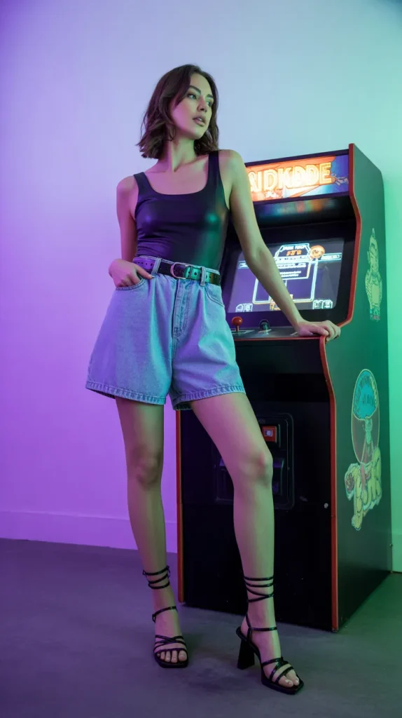 Baggy shorts paired with a fitted bodysuit create a flattering silhouette by balancing loose and sleek cuts. The structure of the bodysuit enhances shape while the oversized shorts keep it casual and easy. Imagine leaning on a retro arcade machine surrounded by neon lights, feeling confident and stylish 🎮. Strappy sandals and a belt elevate the outfit, adding polish to the relaxed shorts. This is one of those versatile looks that work during the day with sneakers and easily transition into a night look with heels. The contrast between oversized and fitted keeps it modern and chic. Women who love relaxed fits but still want to look put-together will appreciate this pairing.