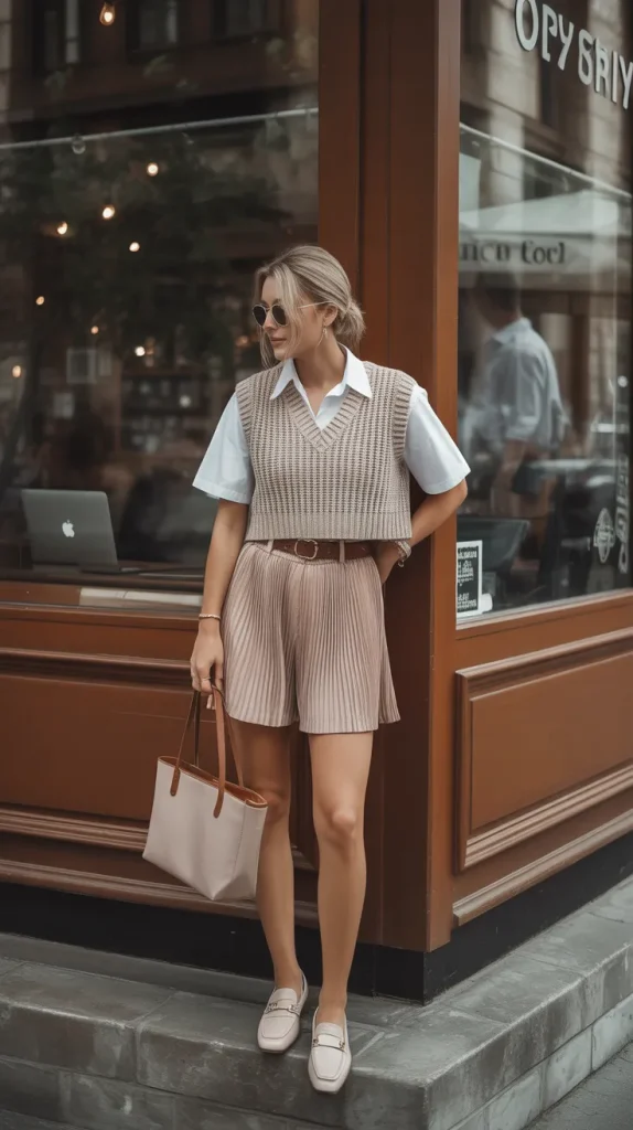 Pleated shorts paired with a cropped knit vest create a preppy-inspired outfit. Layered over a white shirt, this look feels polished but approachable. Loafers and a mini tote finish it off with chic energy 📚. Perfect for coffee shop study sessions or casual workdays, this outfit balances comfort and style. The pleats add dimension, while the vest gives it a modern edge.