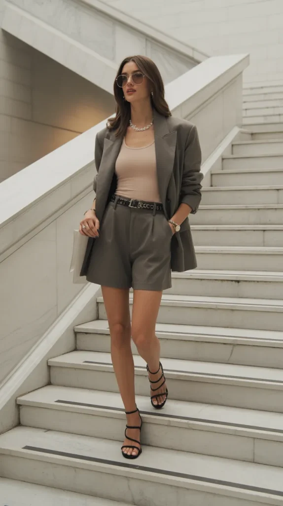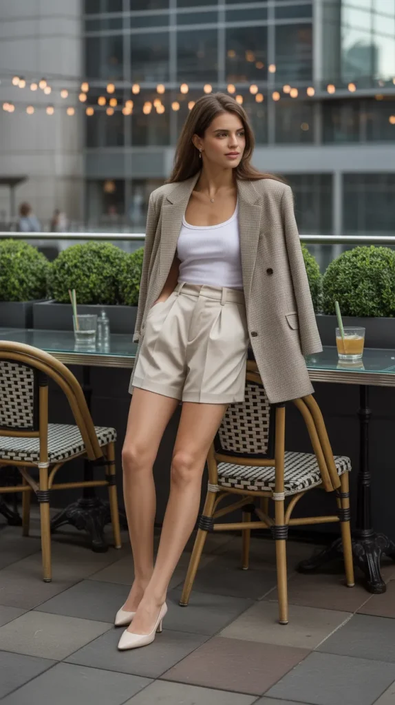 A blazer paired with shorts creates a look that’s polished yet trendy. Beige tailored shorts styled with a fitted tank and oversized blazer make for an effortlessly chic combination. Pointed flats or sleek loafers keep it stylish but comfortable. Perfect for rooftop cafés or evening catch-ups with friends, this outfit strikes the right balance 🌆. The blazer elevates the casual shorts, while the neutral palette makes it versatile across seasons. It’s a great choice for women who want to look sharp without sacrificing comfort.