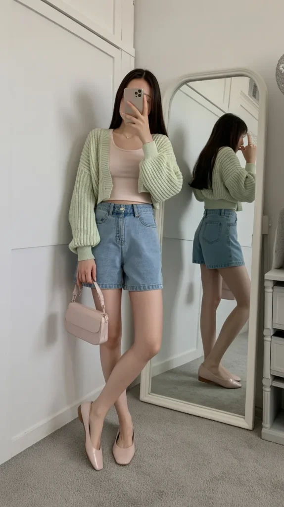 For a cute comfy outfit, pair high-waisted denim shorts with a cropped cardigan. The cardigan adds a cozy yet chic touch, especially in soft pastel shades. Ballet flats and a mini handbag make the outfit feel girly and easy to wear 👛. This outfit is perfect for casual shopping trips, coffee dates, or even lounging at home. The cropped cardigan highlights the waistline, balancing the relaxed vibe of the denim shorts. This look feels effortless but polished enough for casual outings.