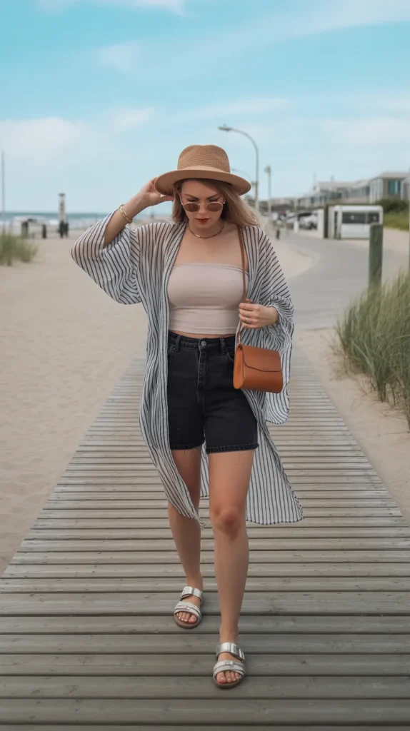Mini shorts styled with a tube top and flowy kimono bring in beachy boho vibes. The black shorts provide balance, while the kimono adds movement and style. Paired with sandals and a crossbody bag, this look is perfect for walks along a boardwalk or relaxed beach evenings 🌊. The outfit feels light and effortless, ideal for summer travel or vacation wear. The kimono acts as both a layering piece and a statement accessory, making the outfit stand out.