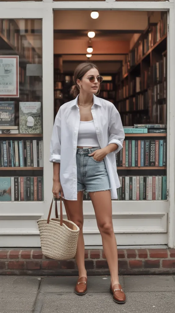 Denim shorts paired with a crisp oversized button-up shirt are a timeless classic. The contrast between structured shirt and casual shorts creates a balanced everyday outfit. Add loafers and a straw tote for a touch of chic charm ☕. Perfect for bookstore browsing or café hopping, this look is casual but still refined. Rolling up the sleeves gives it an even more laid-back touch. This outfit proves denim shorts can always feel fresh with the right styling.