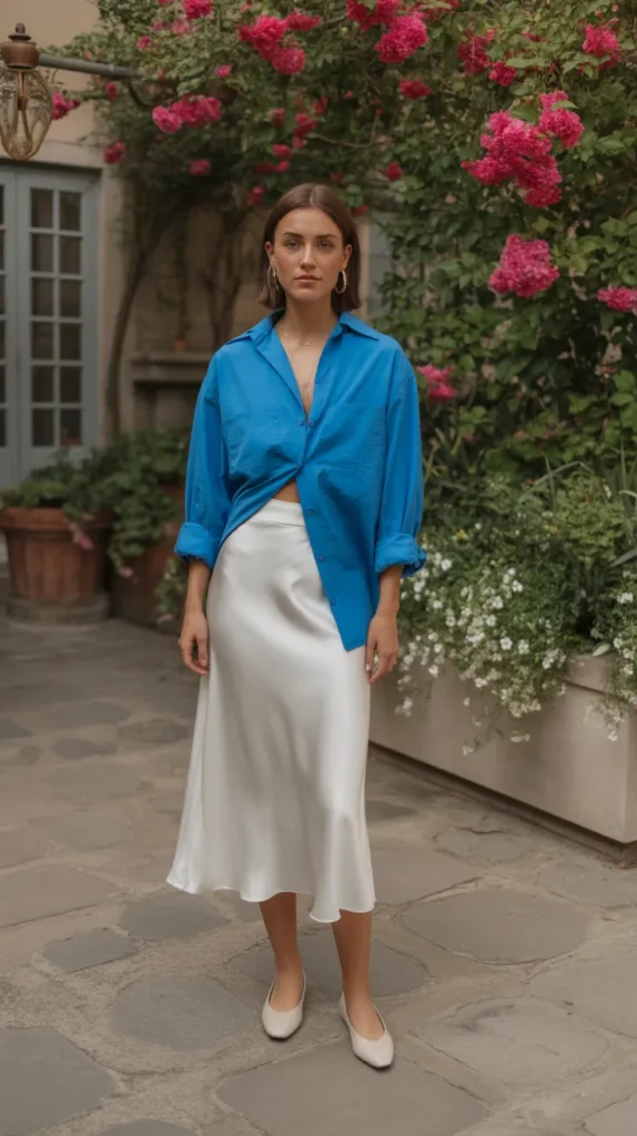 10. White Silk Midi Skirt with a Light Blue Oversized Shirt