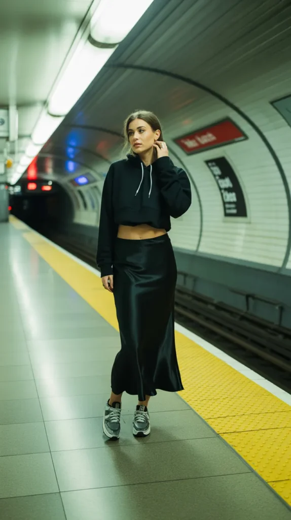 This outfit blends sporty and chic in the best way. The cropped hoodie adds a cozy streetwear edge, while the silk maxi skirt gives you length and movement. Sleek sneakers help balance textures and keep everything casual. It’s perfect for casual outings where you still want to look put-together. Add a minimalist bag to complete the look.