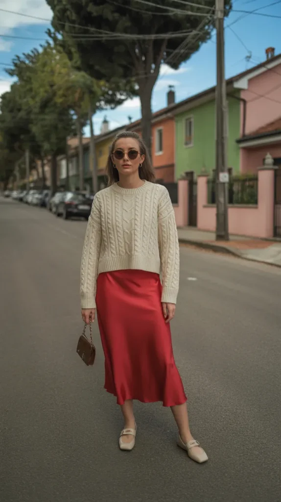 This look mixes bold color with cozy texture a combo that works beautifully in cooler weather. The red silk skirt adds movement and shine, while the cream knit softens the entire outfit. Pair with ankle boots or flats depending on your plans. Add small gold jewelry for a warm touch. It’s a great balance of soft, bright, and effortlessly chic.