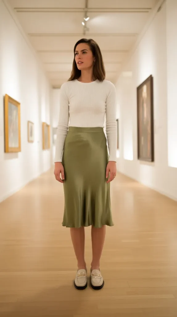 14. Olive Green Silk Skirt with a White Ribbed Long Sleeve