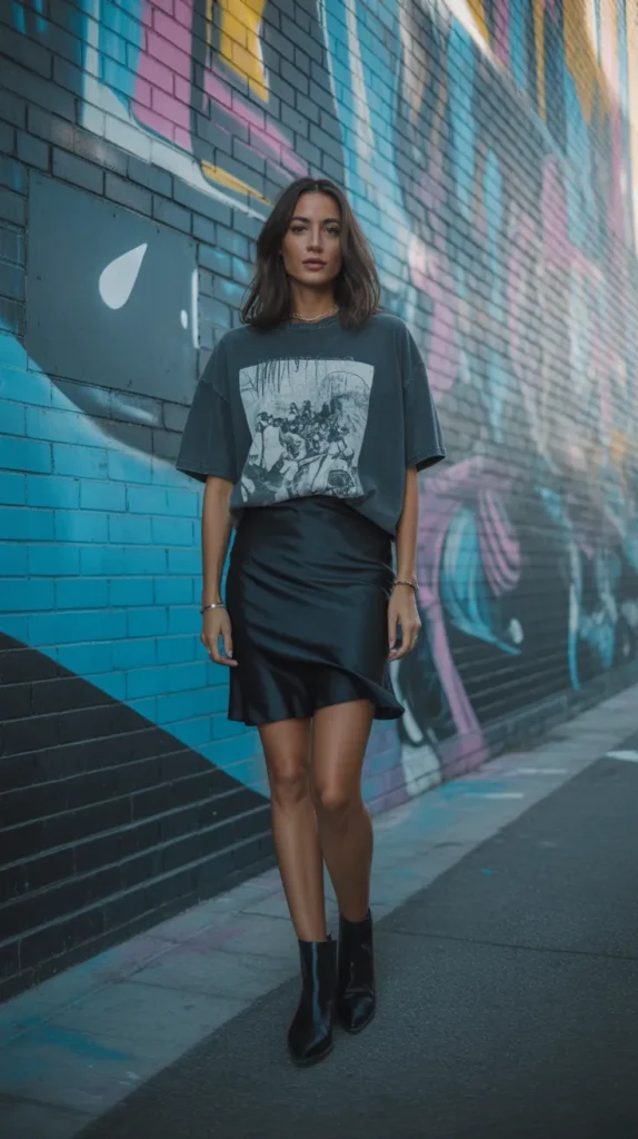 15. Black Knee-Length Silk Skirt with an Oversized Graphic Tee