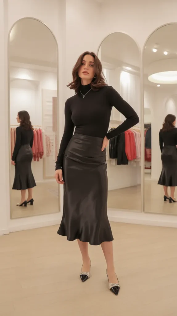 A fitted black silk skirt creates a sleek base that instantly feels polished. Pairing it with a long sleeve bodysuit adds structure and shape, keeping the outfit flattering from top to bottom. Sleek flats make it comfortable but still chic, especially for casual evenings out. Add delicate accessories to soften the overall look. This is one of those combos that feels minimal but makes a quiet statement.