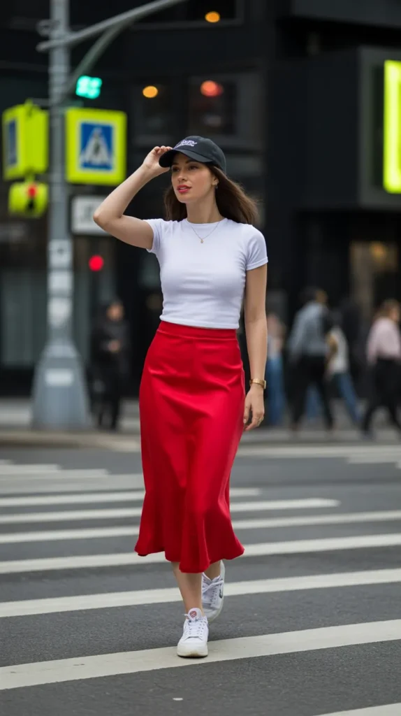 Sporty-feminine styling comes alive with this simple but charming pairing. The bold red color gives movement and attention without being overwhelming. A neutral baseball cap brings fun everyday energy, perfect for running errands or weekend plans. White sneakers help balance the look and make it feel casual. Add a modern tote, and you’re ready for anything the day throws at you.