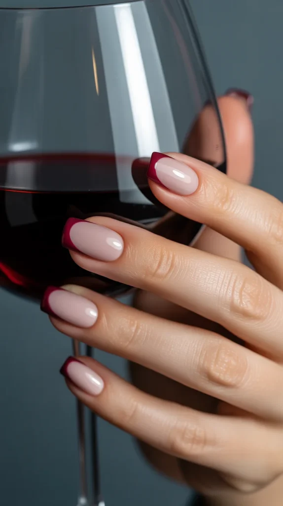 12. Nude Base with Thin Burgundy Tips