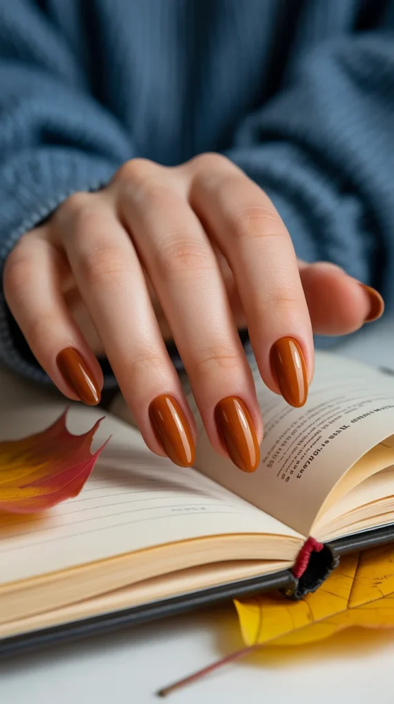 Caramel on almond nails = instant cozy vibes. ☕ This shade looks like your favorite latte, making it one of the easiest fall nails to wear daily. IMO, it’s the perfect in-between neutral for autumn.