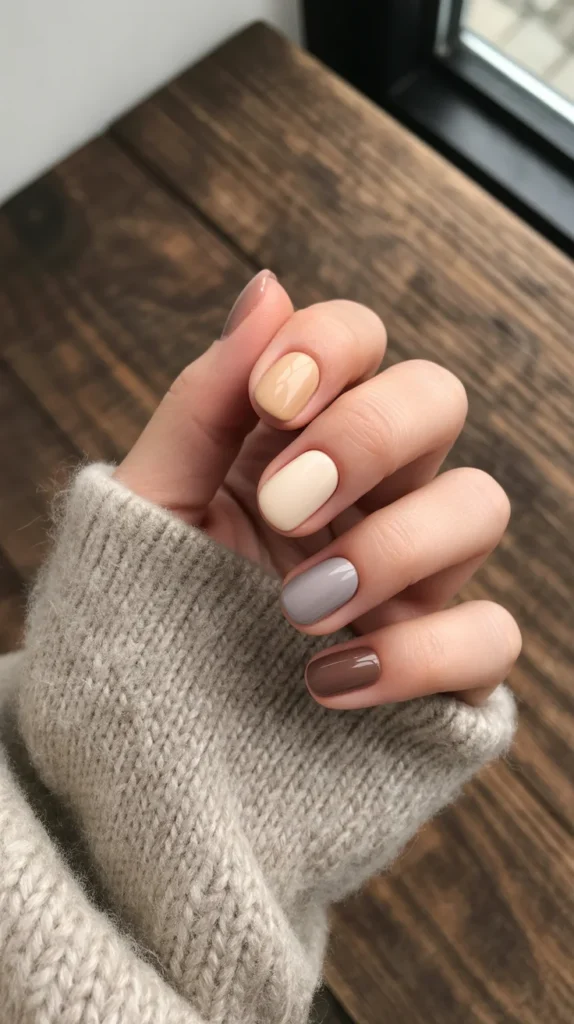 Why pick one neutral when you can wear five? Beige, cream, tan, soft grey, and milk chocolate create a mini-palette on your nails. Super fun but still simple autumn nails that stay classy.