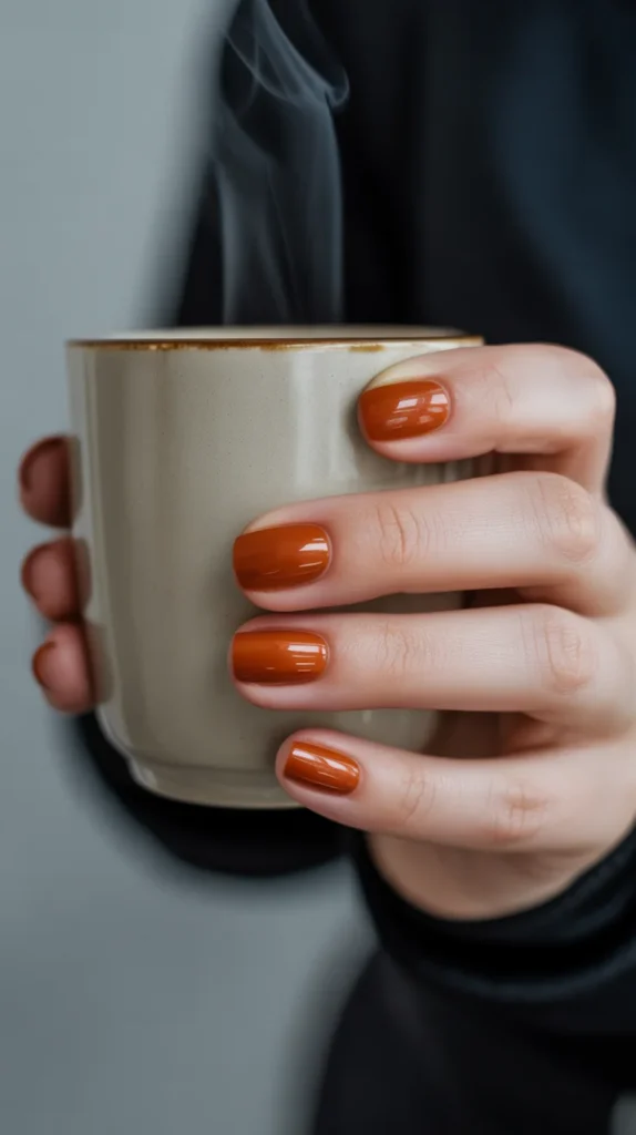 Burnt orange is fall in a bottle. 🍁 On short nails, it’s bold but still easy to wear. A must-try if you want simple autumn nails that pop without nail art overload.