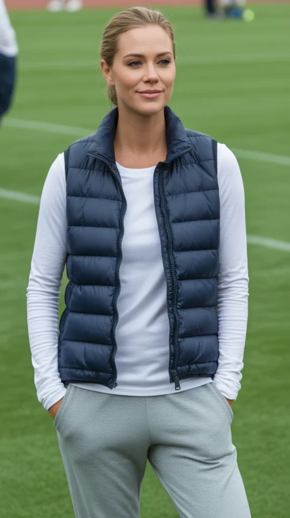 A navy puffer vest over a white long-sleeve tee with joggers and slip-on sneakers makes for a layered soccer mom fashion look that’s cozy without being bulky.