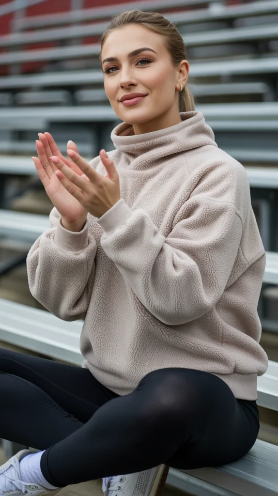 Soft fleece paired with black leggings and white sneakers is perfect for early morning matches. This soccer mom outfit spirit week combo keeps you warm and game-ready.