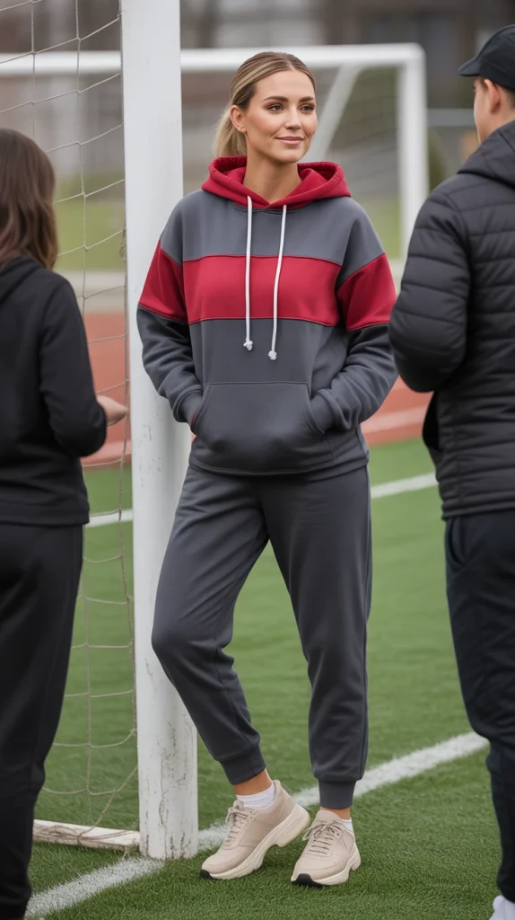 A hoodie in bold team colors with charcoal joggers and chunky sneakers creates an easygoing soccer mom fashion look that’s ideal for mingling with other parents.