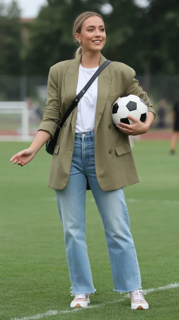 For a more elevated fashion mum approach, layer a casual blazer over a tee with straight-leg jeans and sneakers. Add a crossbody bag, and you’ve got sporty outfits with a polished edge.
