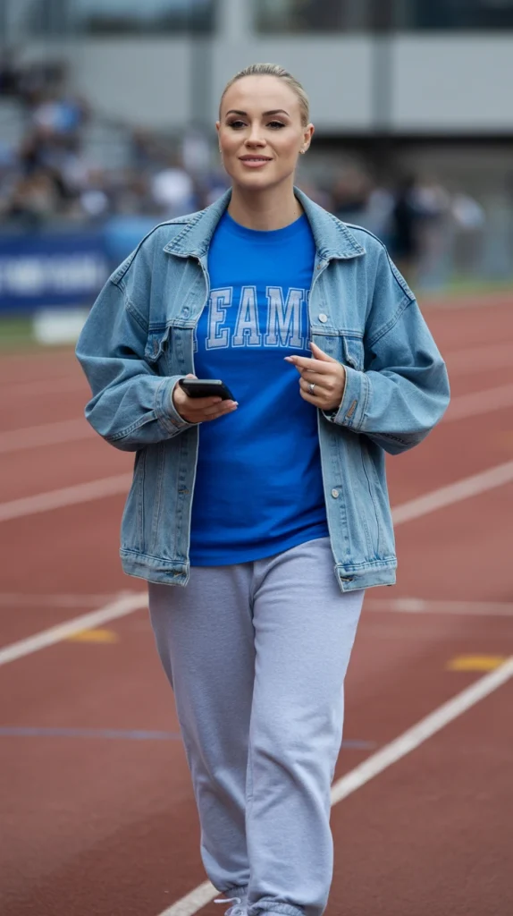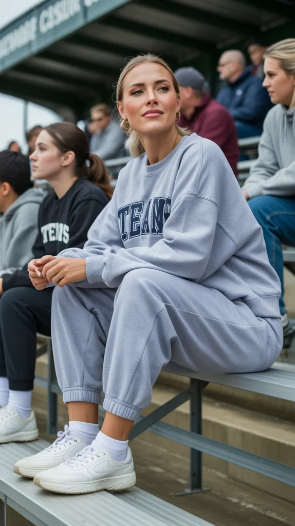 Grey joggers paired with an oversized team-colored sweatshirt and white sneakers keep things cozy while showing your team spirit. This is an easy soccer mom fashion choice for chilly game days.