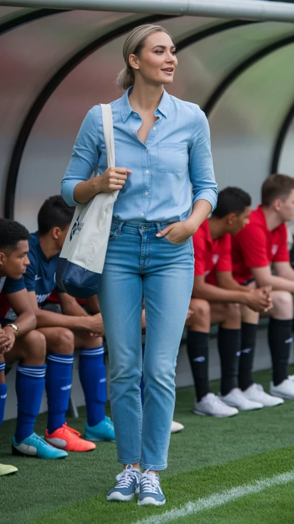 Slim blue jeans, a chambray button-down shirt, sneakers, and a roomy tote strike the balance between polished and casual. It’s a soccer mom outfit spirit week option that works for sideline support or after-game errands.