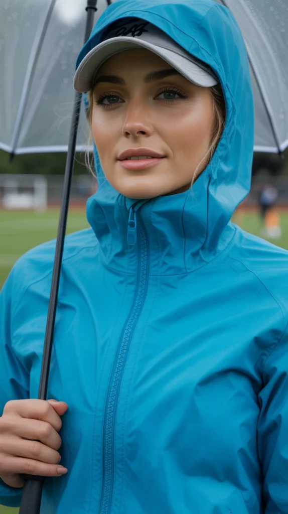 A bright waterproof rain jacket, slim athletic pants, and a team baseball cap keep you ready for any weather. This sporty outfits combo is a must-have for unpredictable match days.