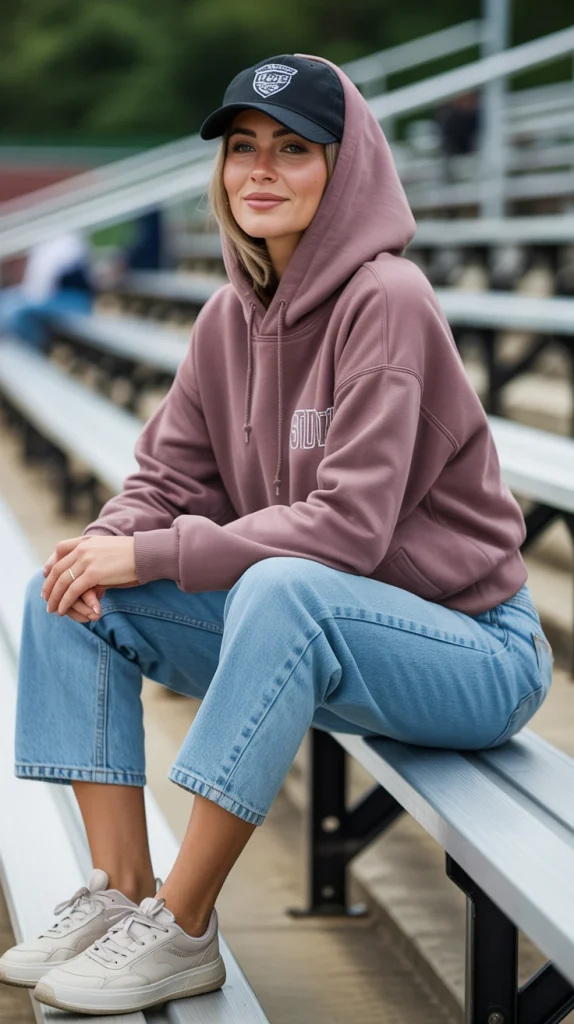 A cozy hoodie with cropped jeans, sneakers, and a team hat is a relaxed fashion mum look that still shows spirit. Great for breezy afternoon games.